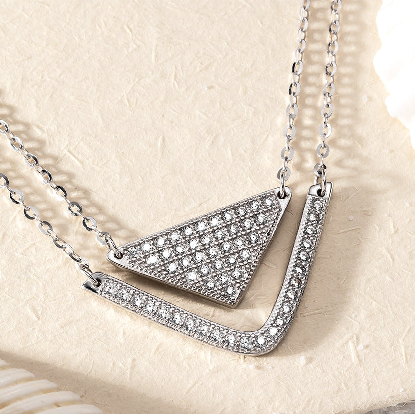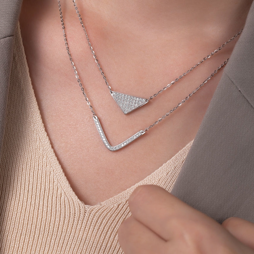 Style: Layered necklace with geometric pendants – triangle and inverted angle